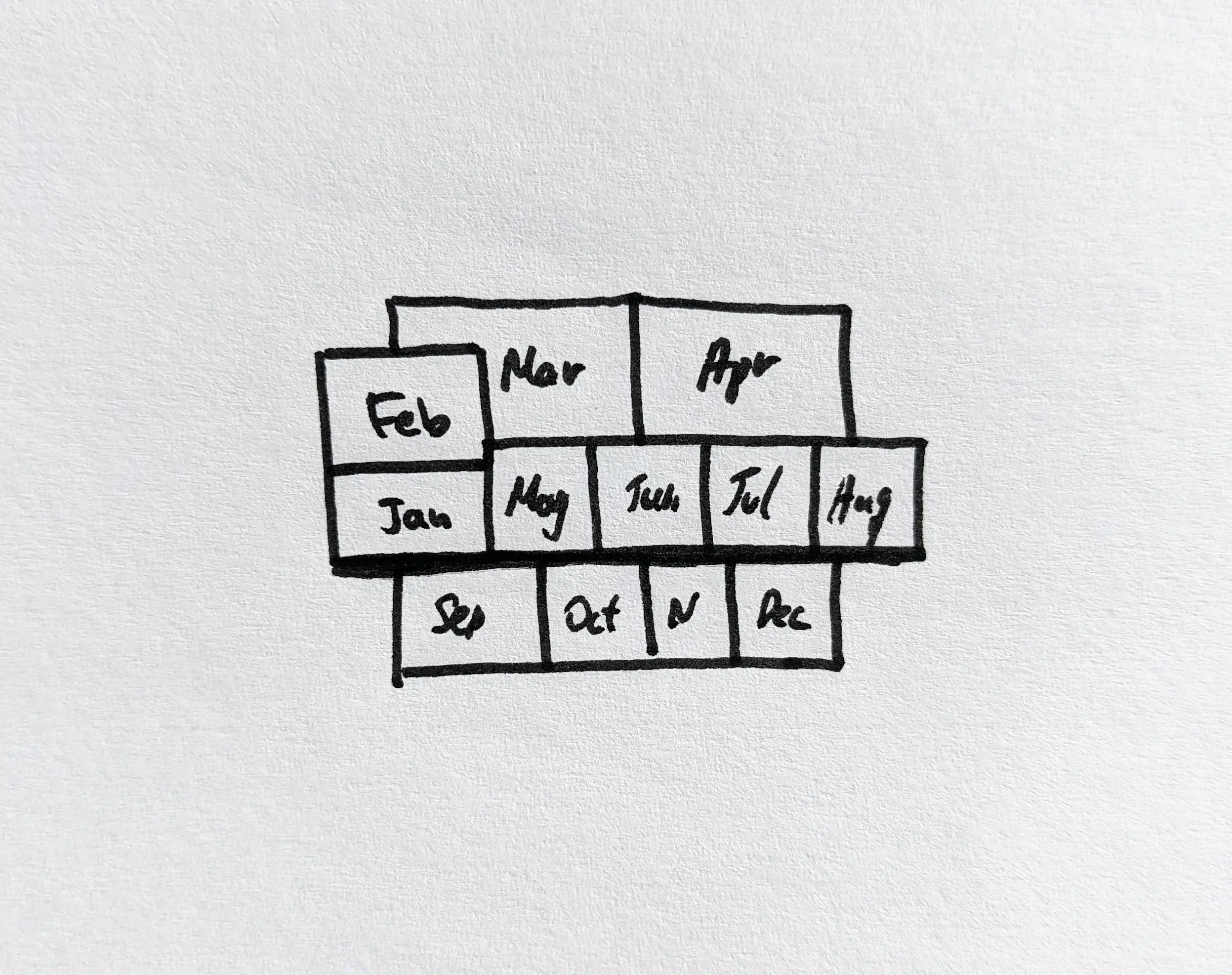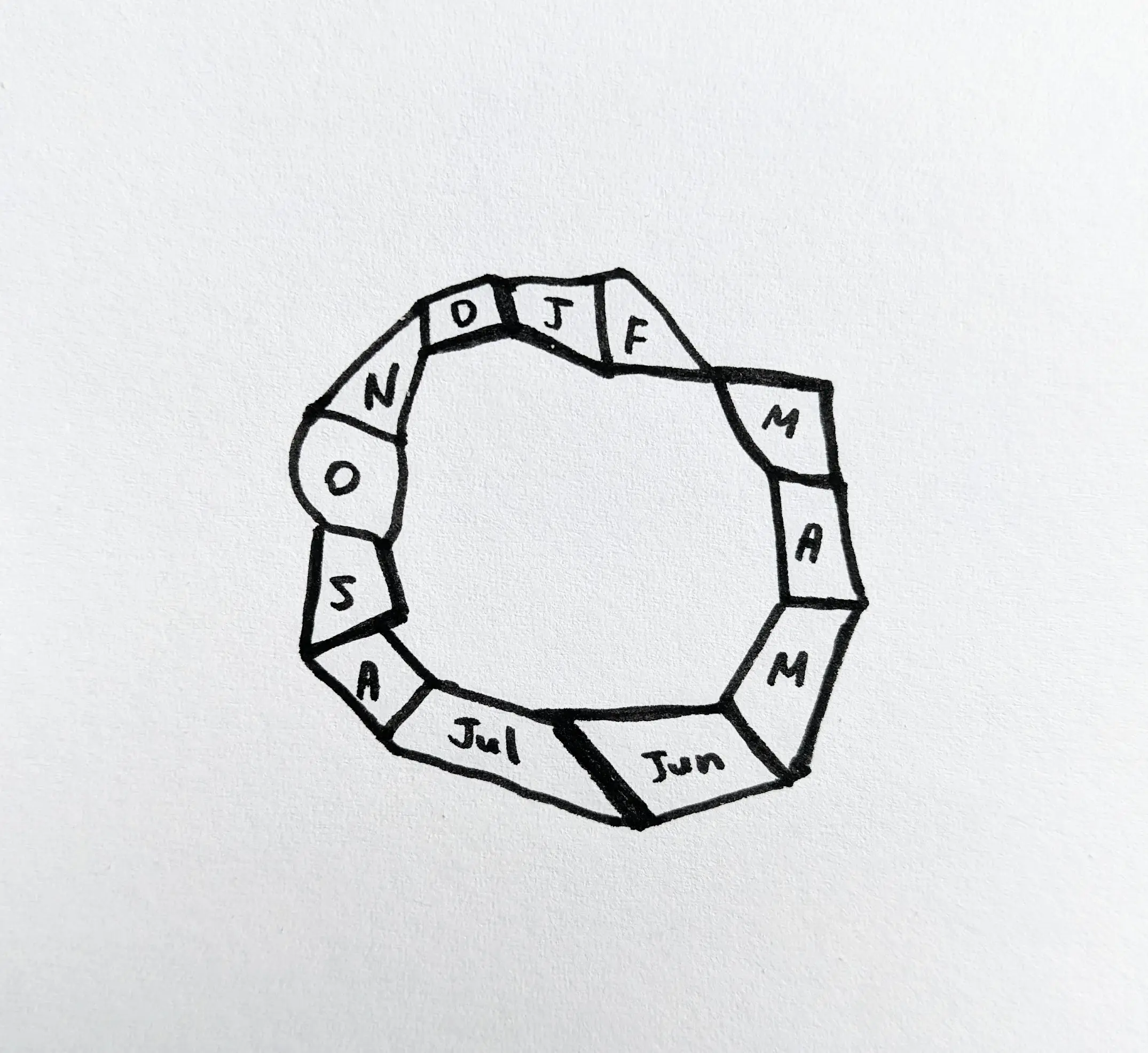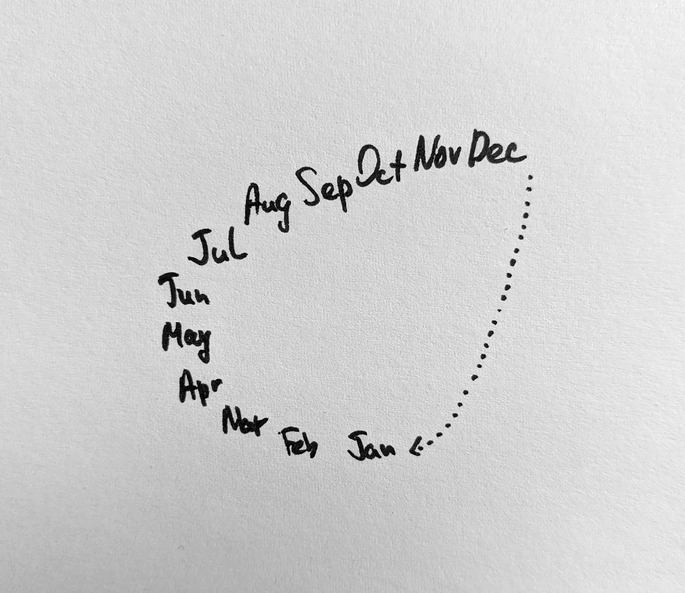 If I need to “see” a specific month, it’s like zooming the image. The curvature of the “timeline” is preserved. For instance, April is always kind of vertical and the days in it go top to bottom. While July is always horizontal and the days go from right to left. Month labels do not really exist in my mental image, because I don’t need to “read” them. I always intuitively know which month I am looking at.